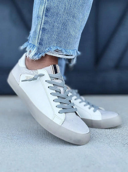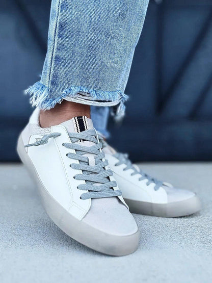Elevate your sneaker style with the Rebel in White. Featuring a smooth faux leather body paired with a textured faux snakeskin heel, these sneakers effortlessly catch the eye. With a lace-up design, cushy rubber sole, and our iconic gold SHUSHOP charm, they’re the perfect mix of bold and easygoing for everyday wear.
